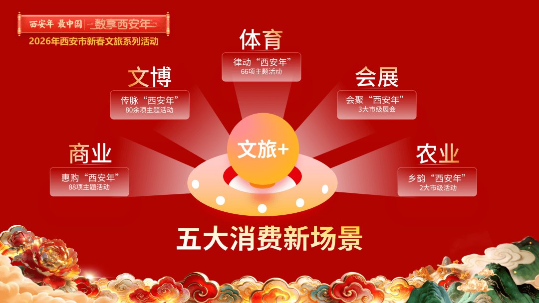 “5”类跨界场景:精心策划惠购“西安年”(融合消费)、传脉“西安年”(文博研学)、律动“西安年”(冰雪体育)、会聚“西安年”(年货展会)、乡韵“西安年”(乡村休闲)5类新消费场景,打造群众满意、企业受益、消费提振的“西安年”。