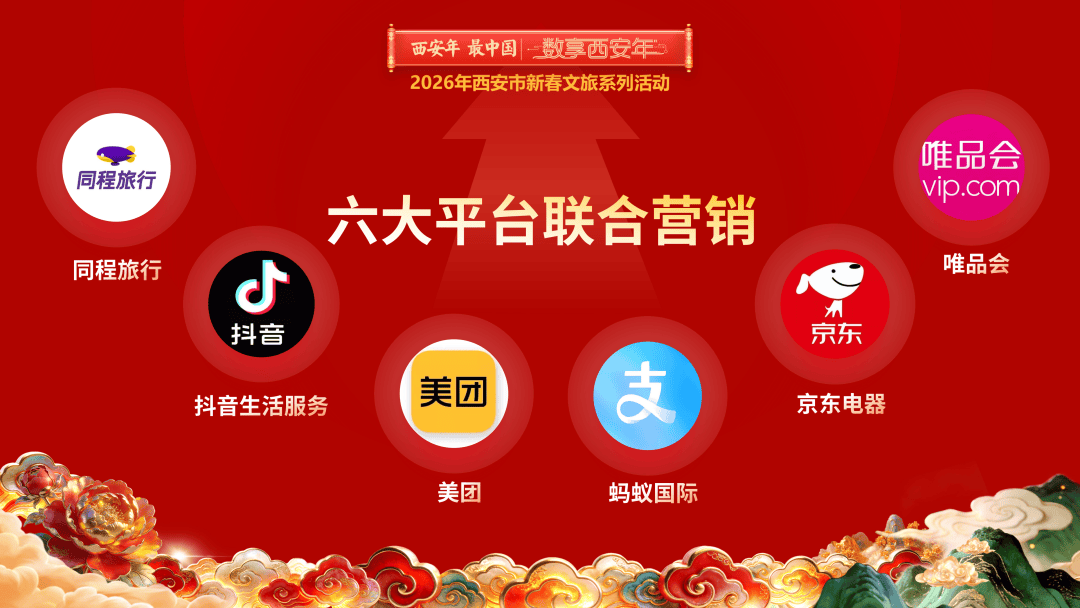“6”大平台联动:深度联动抖音生活服务、同程旅行、美团、蚂蚁国际Alipay+、京东电器、唯品会等6大平台,开展定制营销与消费补贴,通过诚意满满的“新春红包”助力四海宾朋畅游西安。